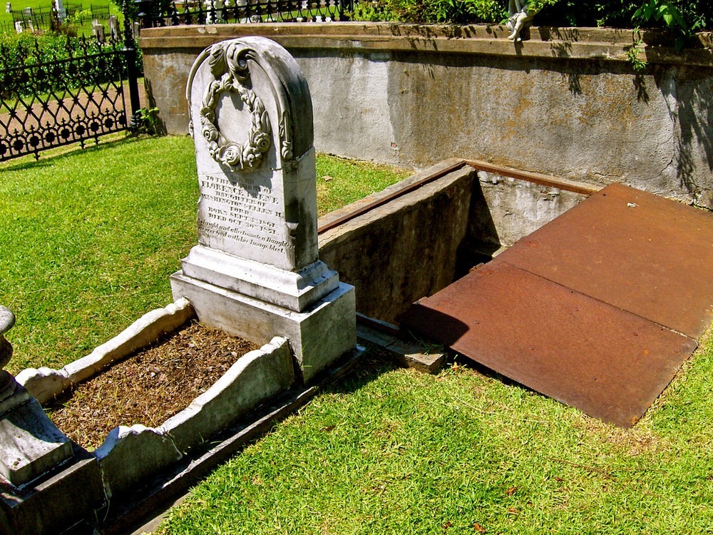 A grave site was prepared and a separate area was dug out at the same depth as the coffin to allow the mother to descend to the level at which Florence was buried so that she could sit there and console her daughter during scary stormy nights. Hinged metal trap doors were installed to shelter the mother while she occupied the enclosure near her beloved child’s coffin. Even today, visitors to the gravesite can open the trap doors and descend the steps to enter the chamber where the grieving mother would sit.